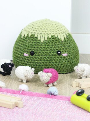 Misty the Mountain is 6 inches tall, using worsted weight yarn. Written in American English crochet terms.