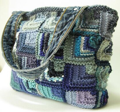 Mitred Squares, also known as Domino Knitting, also known as Modular Knitting - some of the names for this great patchwork technique. Yes, it's knitted in squares but there's only two seams to sew to make this bag. Each square is picked up from those around it. The size of the bag depends on the yarn you use. So if you want a small handbag (9x8x2in) use 4ply yarn. A bigger handbag (12x10x2.5in) uses DK yarn. A large tote bag (17x15x3.5in) uses chunky yarn.