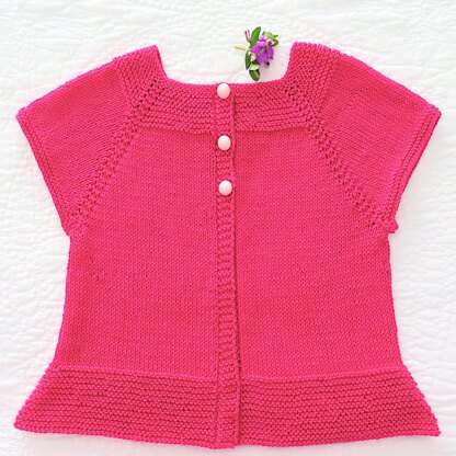 This seamless girl’s cardigan is made top down with integrated neck and button bands. When the knitting is finished just weave in the ends and sew on the buttons. It has a very simple neckline, cap sleeves and a length that goes a bit below the waist, making it perfect for layering over a summer dress or tank top. Mostly stocking stitch, it has some garter trim on the yoke and a garter trapeze hem to give it some cute shape