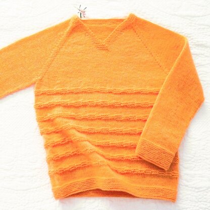 At a certain point the v-neck bands along the front edges are knitted together, from then on we work the pullover in the round. The body is decorated with very easy textured panels of stocking stitch followed by knit 4, purl 4 rounds & depending on your yarn colour it will be suitable for a girl or boy.