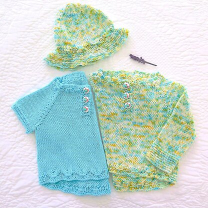 Seamless baby cotton tops, with short and long sleeves, made mostly in the round, top down with integrated neck & button bands, and plenty of room to grow. Sunhat is knitted in the round starting with the brim. When the knitting is finished all we have to do is weave in the ends & sew on the buttons.