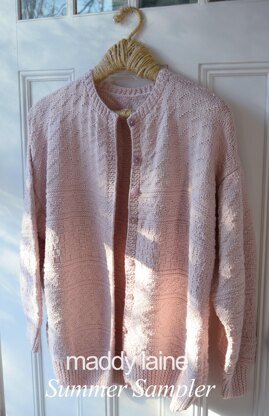 A maddy laine knitting pattern featuring combinations of easy-to-knit textured patterns to create a classic garment in a pullover or cardigan style. The stitch patterns are an easy six-stitch count each.