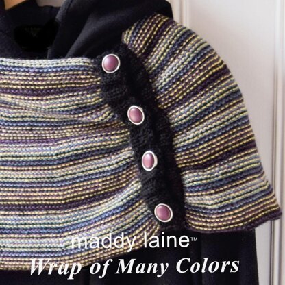 A maddy laine knitting pattern that combines color and reverse stockinette stitch in a versatile wrap that is shaped from the lower edge, creating a comfortable fit around the neck and shoulders.