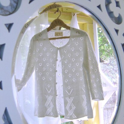 A maddy laine knitting pattern for a lacey-patterned cardigan that creates a little swing from the wasitline to the lower edge.