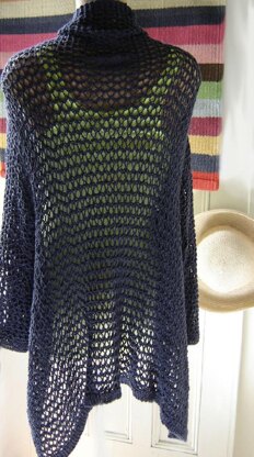A maddy laine knitting pattern for a lightweight cover-up to knit in an openwork netting stitch. The garment knits up as a one-piece rectangle and all borders are knit as you go. Sleeves are picked up with a circular needle and knit to cuff edge.