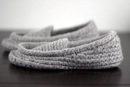 These moccasins have a crocheted bottom with knitted tops and sides. They are semi- felted so that the stitches are still partly visible. These are a quick project that would be great for a gift to a friend or just for yourself. Because the yarn is held double, the moccasins are sturdy and tightly worked to last throughout the winter. The top part of slipper is seamed on. Short rows are used so the moccasins have a slightly higher ride along the back and sides for a more comfortable fit.