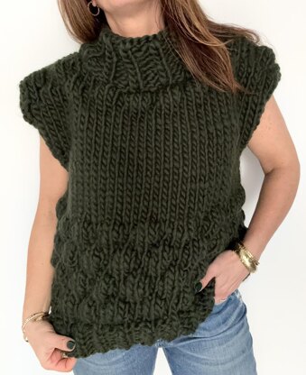 This vest is super warm, cozy, comfy, and oversized in just the right way. You can wear it with jeans, a dress, over a blouse, or even in the summer on a cool night out. It is knit with super bulky yarn and is super quick to knit. The boxy shape is flattering and forgiving, and knit with a very fun and simple stitch pattern to give it an extra dimension.