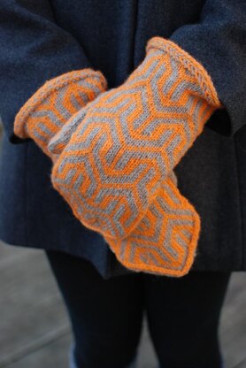 This pair of stranded colorwork mittens start with a Latvian braid and feature a bold design reminiscent of the Mod designs of the 1960's. The colors are reversed on the palm for added interest.