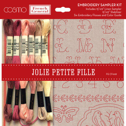 Create some beautiful embroidery in no time with the Jolie Petite Fill Embroidery Kit. With a printed 15” x 12” linen sampler featuring designs of letters, numbers, butterflies, and flowers, the kit also has six flosses in tasteful reds, pinks, and yellows, and includes iron-on stabilizer.