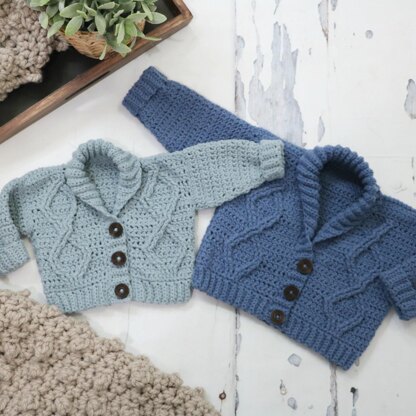 The Modern Baby Cabled Cardigan is a stylish modern piece with 3 buttons and rolled over collar. An easy loose fit for infants 0 to 24mth. Pattern includes front panel video tutorial for cable design. Designed in Mary Maxim Oh My So Soft for a soft and cozy cardigan for baby.