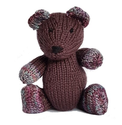 This bear can be knit all in one colour of yarn, but the pattern also offers alternate directions for knitting contrasting coloured paws on the arms and legs.
