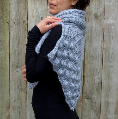 Inspired by the bumpy moguls’ slopes that my kids used to love skying on, this shawl is heavily textured by chunky ribbing framed at both ends by wide borders of bubbles which are both warm and fun!