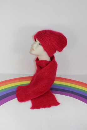 This is my Mohair Rib Slouchy Beanie Hat & Scarf Set. This lovely mohair set is quick and easy to make whilst very thick and luxurious because it's worked flat using 3 strands of the yarn held together. The knitting pattern provides full instructions for 3 sizes S (child), M (woman) & L (man) and there are photos to help throughout.