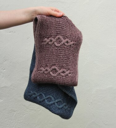 Móin (the Irish for peat) is a cowl worked in two colours, with a cable motif worked over a striped garter stitch background. The pattern is worked in the round, and is written in two sizes. The cable is inspired by classic rope cables that often feature on Aran designs. Only one colour is worked in each round; the cable stitches are slipped when working contrast colour rounds. Cable instructions are given in both charted and written form.