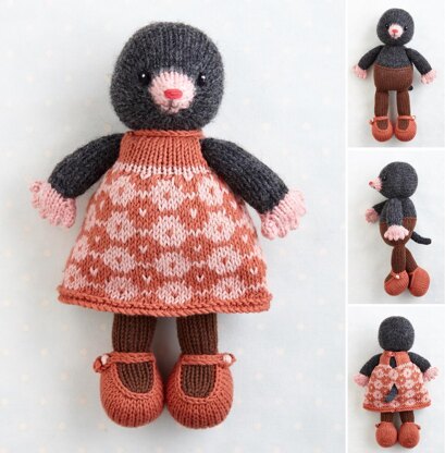The file is 16 pages long and contains over 50 detailed step-by-step photographs along with full pattern instructions and tips for stuffing, seaming and finishing neatly. It contains full instructions for knitting and finishing off a mole with knitted on tights/pantyhose and shoes and a choice of two removable dresses. The Mole is knitted flat with worsted weight yarn on 3mm needles and 4ply/fingering weight yarn on 2.5mm for the shoes, legs and lower body. All pieces are seamed afterwards. The dresses are knitted flat using fingering/4ply yarn on 2.75mm needles and seamed. One is knitted in two colours in stranded colour-work and the other in a single colour with a textured design.
