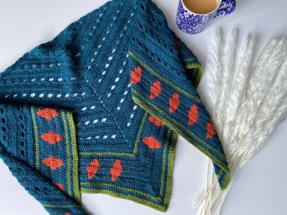 This soft and cosy autumnal shawl has a gorgeous texture and uses a spot of tapestry crochet to create a fun and vibrant edging.