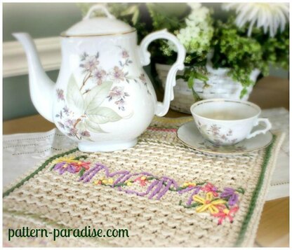 This is a nicely textured dishtowel with an interesting combination of stitches. But if you want to take it to the next level, add some or all of the embellishments for a really special piece. This would make a pretty tea towel too! I monogramed it with MOM, but of course you can ad whatever you like or nothing at all!