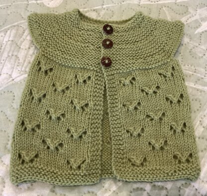Monarch Butterfly Light has a vintage feel to it and will become an heirloom piece to be handed down from baby to baby. Top down construction, with a 3 or 4 button closer. This is designed with positive ease, so there will be room to grow into a tunic. Suitable for Fingering or Sock.