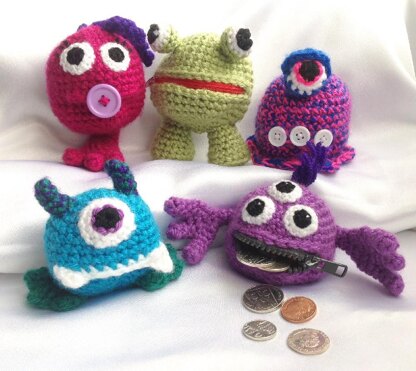 This is a fun pattern with endless possibilities to create a collection of Money Monsters, coin purses. This pattern will give you instructions for a main body and many choices of components to create your own unique monster design. It includes photographs of all the parts so you can decide on which to use. You can even create funny faces instead using this pattern.