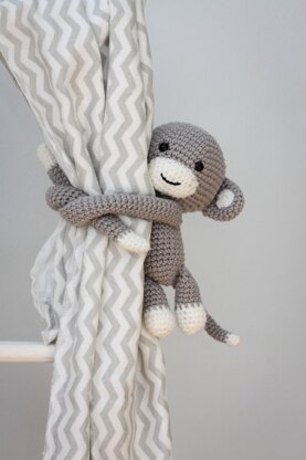 This is a pattern with all the instructions you need to create an adorable cheeky monkey that can be used to tie back curtains in a nursery.