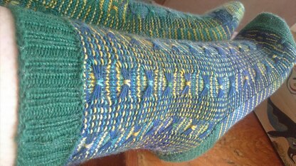 Made for using up leftover yarn, this pattern is written top-down with short row garter stitch heel and toe. It is very stretchy, so the lack of gusset stitches shouldn't be a problem even for high insteps. Each round of the leg and foot portion of the sock is knit with one colour at a time, but two yarns are used by alternating which you knit with.