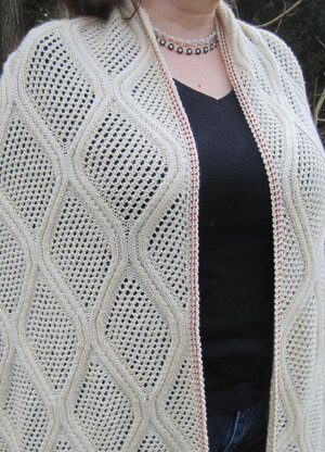 This is a pattern for a rectangular shawl that’s created using a single cable lace stitch, that makes quite a statement. The shawl itself is knit in a single piece which is 22 inches x 72 inches. There are instructions contained within the pattern for three optional crocheted edgings: (1) One that is simply crocheted (2) one that is crocheted with size #8 Japanese seed beads and (3) one that is crocheted with size #6 Japanese seed beads. All three of the edgings use a single crochet, so that if you’re familiar with that stitch, there are instructions for a bead single crochet (bsc).