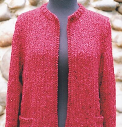 A classic Chanel type unbuttoned cardigan jacket. The pattern also includes instructions for DK weight yarn.