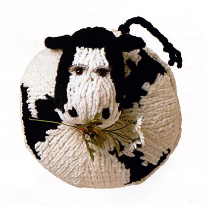 MooMoo’s eating a daisy and couldn’t be more content. Add a bell around her neck if you are afraid she will get lost. The body is spiral knit with the spots knit in. No two cows are alike so make your own cow spot coloring.