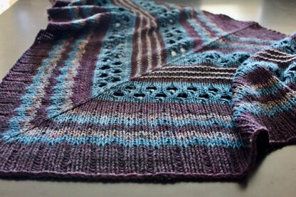 The three deep colours of this top-down triangular shawl express a certain mood. Choose any three colours to express your mood. Worked in worsted weight yarn, this is a warm and cozy shawl for cool days. The stitch patterns here incorporate colourwork, eyelet lace, and stockinette with a touch of garter stitch. All sections are easy to work and complement each other perfectly. See also: Moody Cowl.