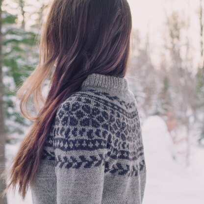 The Moon Cabin Sweater is my go-to practical sweater to keep me warm. The double ribbed collar, higher than a crew neck but lower than a turtle neck for optimal comfort and warmth, the two-color yoke worked in stranded colorwork and the long sleeves are the secret formula of this warm sweater. It is worked from the top down, starting with the ribbed collar, followed by an optional short-row section to elevate the back. The yoke is worked next. When it’s completed, the sleeve stitches are placed on hold and the body is worked without shaping. The sleeves are worked afterwards. The colorwork, reminding me of moons, leaves and flowers, is repeated at the bottom of the body and sleeves. Available in 10 sizes, this sweater worked in DK weight yarn is sure to please everyone.