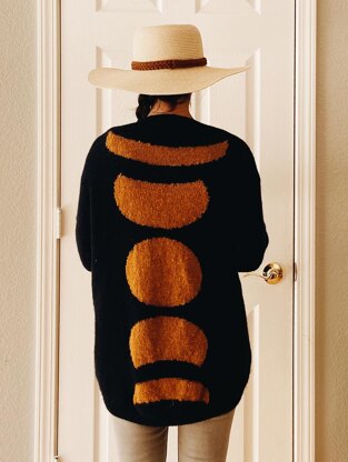 The Moon Cardigan is a long, slouchy, and relaxed cardigan with roomy pockets. The main characteristic is the intarsia colorwork on the back.