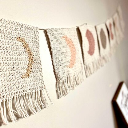 What you need for this pattern: Yarn: • Color A - I used Bernat Handicrafter 100% cotton yarn for the background, Off White color, approx 280m/306y without fringes, with fringes is about 30m/33y more. • Color B, C, D and E - I used Caron Cake Drift Wood color for the moon phases. I split the colors from 1 skein (I got 5 colors). I used only 4 colors. • 12ft/3.7m yarn folded on half (this string is for the moon phases to hang them on)