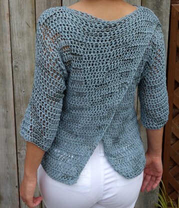 This design is a blend of modern and rustic style, featuring open back. The yarn I worked with has a variation of shiny and matte texture to add more interest to it. The top is worked in one piece, seamed on of shoulders. The back pieces are overlapped producing a unique intricate design.