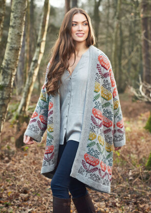 This is a statement that's testament to your knitting skills. Martin Storey's beautiful multi-coloured Alpaca Soft jacket updates traditional floral motifs in modern colors and a flowing silhouette. Worked in separate pieces, experienced knitters would have no trouble converting this for steeking.