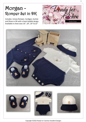 Pattern includes unisex Romper, Cardigan, Sunhat and Shoes with a heart bobble design. Option for including knitting in lace with added tulle, lace etc. to give a ballerina style skirt below rib waist. Buttons on back and crotch of romper for easy changing. Short and long sleeve instructions for Romper. Contrast colour(s) can be used for bobbles, bands and sections of the items. Shoes can be knitted plain or with bobbles on the front