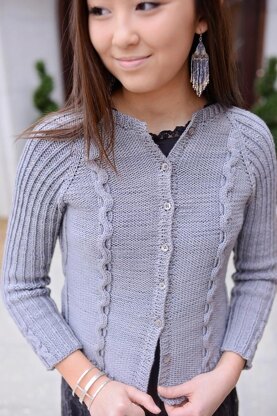 This cardi begs to be worn all day, from morning coffee to an evening out. It’s worked top-down seamlessly with raglan sleeves. Cables steam their way up each front, down the back and accent each wrist. Design includes two collar options: the original cozy shawl collar doubled for stability and extra warmth or a more delicate crewneck for milder conditions. Sleeves are worked in a super stretchy rib to make the fit accommodating and include both bracelet length and long sleeve instructions. Gentle waist shaping is highlighted with flattering cabling at the natural waist. Increases and cables are charted. Instructions are geared towards experienced knitters comfortable reading their work and incorporating new stitches into pattern while working with multiple charts. Shown in Small (grey) with no ease and Medium (pink) with 2”/5 cm positive ease