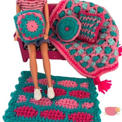 This crochet pattern will help you create Moroccan themed doll house accessories including 3 different scatter cushions, a rug and a blanket. The designs feature bold and fun patterns and colours. These will fit 12” fashion dolls and 1:6 scale doll houses.