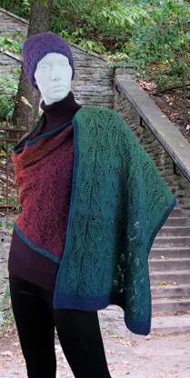 The yarn used in the sample comes in a five-cake pack of 1720 yds / 1573 m, and one pack will make both the shawl and hat