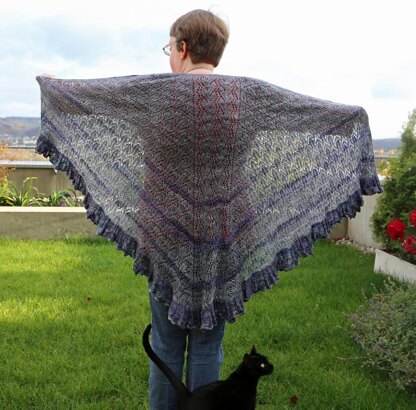 Morwen is a Faroese shawl knit from the top down. It can be easily adjusted to the size you like. The pattern includes instructions for a ruffled and a regular border as well as an i-cord and a regular bind off that can be mixed and matched as you like. The sample shows ruffled border and i-cord bind off.