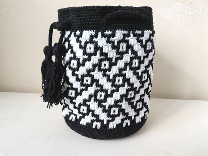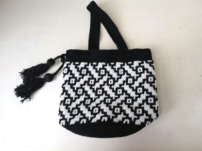 The pattern on this beautiful bag with a geographic design is made with the technique called ‘Overlay Mosaic’. The bottom of the bag and the top of the bag (in black) are made with just Single Crochet (US) or Double Crochet (UK). I have also crocheted a white bag for the inside with just Single/Double Crochet. The outside bag would be flimsy and unstable so this inside bag will give the bag some extra structure and firmness.