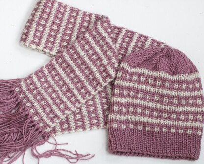 Two patterns: a cute modern beanie hat that is worked in the round and a completely reversible scarf, no wrong side.