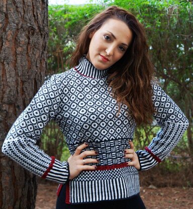 This sweater was inspired by the tribal prints and ethnic patterns that have influenced the fashion trends. Being a lover of the gorgeous Moroccan tiles, I designed a mosaic of patterns, in black white. Sassy details, the cuts on the sides and the lovely flower pattern row in burgundy.