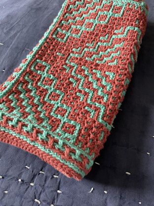 Worked in overlay mosaic crochet with a linen-cotton blend, this pattern produces a lovely pattern that is reversed on each half of the dish towel. You can customize it with a monogram or symbol of your choice, or just follow the basic pattern. It looks great to have the basic pattern on the back and monogram on the front. The coordinating washcloth can double as your gauge swatch.