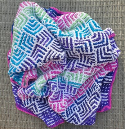 This reversable baby blanket is made using overlay mosaic crochet technique. The blanket is a double-sided pattern, therefore extra thick and warm for the cooler weather. The blanket is a lot easier to make than it looks, since only basic stitches are used! If you already know how to make a chain, single crochet and double crochet, as well as how to read and follow a crochet pattern, you’re ready to make this scarf!