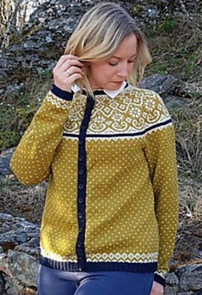Suggestions: Frustration can be avoided by reading through the entire pattern before starting. The jacket is worked top-down, the yoke first. After finishing the yoke, keep the sleeve sts on a st holder (extra circular needles works well as stitch holders) as you work the body. The jacket is worked in the round and 6 steek stitches are worked in the front throughout. These 6 stitches are not included in any of the charts. For steeking, you will need a sewing machine. The pattern has instructions on how to sew and cut.