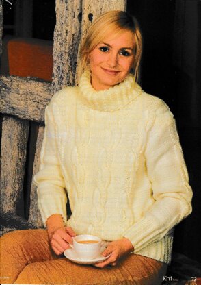 This is a pattern for a Moss and Plain Cable Jumper, originally published I Knit Today. It has a moss and stocking stitch cable repeated on the body and sleeves, a roll neck and rib edges. Photos Knit Today.