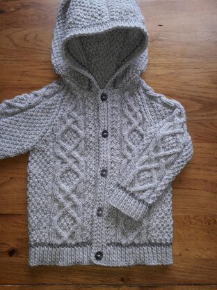 Toddler hoodie, age 12-18 months, 22" chest Knitted in one piece to armhole in double moss stitch and cable panels. Optional contrast stripe at top of ribbing.