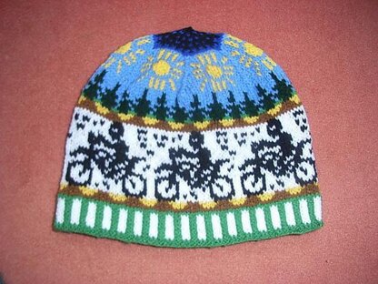 The beanie has a two color ribbing, followed by a little bumpy track border pattern and the motocross bikers. Dirt is in the air.. Above them there is another dirt track, followed by a lit