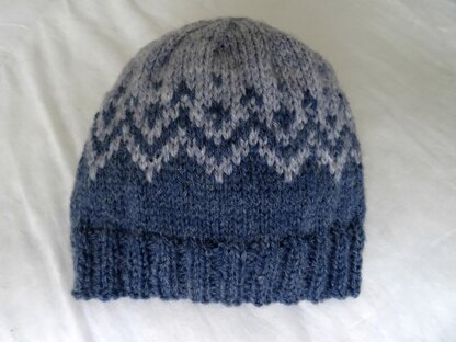 This close-fitting hat features a zig-zag pattern reminiscent of a mountain range. It is knitted flat and seamed, with 8 sizes ranging from baby to adult. You will need to be confident at working basic knit and purl stitches, knitting two stitches together to decrease and be able to work stranded knitting without pulling the tension too tight.