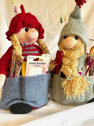 Mr and Mrs Gnome Tidy can be worked with either Double Knit or Aran weight yarns. Double knit stands at 10 inches/ 26cm and Aran weight stands at 11.5 inches.30cm. Great for stash busting.